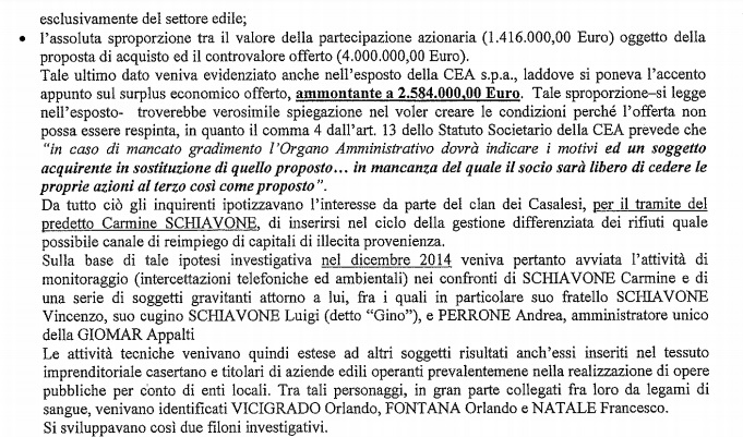 CASAL DI PRINCIPE (g.g.) – Carmine Schiavone, nipote di Elise Schaivone e dunque anche cugino di Vincenzo Petillo Schiavone, possiede una ditta individuale e sulla carta nulla più, ma è in grado di formulare un’offerta di 4 milioni di euro alla Ambra Med srl per rilevare il 16% delle quote di cui quest’ultima era titolare all’interno di Cea spa, società che, tra le altre attività, gestisce il grande biodigestore per il trattamento della frazione umida dei rifiuti nella città do Caivano. Ed è proprio da una denuncia di Cea che parte l’accurata indagine della Dda, che ne assegna la titolarità all’allora Pubblico ministero Anna Maria Lucchetta, divenuta successivamente Procuratore della repubblica di Nola. La Cea resiste perché si rende conto di chi sia Carmine Schiavone. Ma l’offerta è formulata in maniera tale che questa resistenza possa durare fino ad un certo punto. Il valore nominale corrispondente al 16% delle azioni è, infatti, di 1.416.ooo euro. Carmine Schiavone, ripetiamo, titolare di una semplice ditta individuale e di qualche incarico di consulenza, di liquidatore e di sindaco supplente di alcune societò tra cui una intitolata Sandokan srl, cooperativa produzione e lavoro, un nome che si commenta da sé. Il valore enorme tra il valore nominale delle azioni e quello che offre Schiavone, porterebbe inevitabilmente alla chiusura a favore di quest’ultimo della trattativa. La Cea chiede i certificati del casellario e dei carichi pendenti, ma questa volta la napoletana Ambra Med non risponde. Lo statuto della società prevede che il rifiuto del socio, il veto, debba essere precisamente motivato. Non solo, ma occorre che chi questo veto oppone debba essere in grado di presentare un’offerta, direttamente o attraverso altri soggetti, che parifichi quella che viene bloccata. Ecco perché i 4 mln di euro, che non hanno senso da un punto di vista economica, ne hanno dal punto di vista della scalata che Carmine Schiavone, secondo la Dda per nome e per conto dei Casalesi, vuole fare all’interno di questa società per azioni.