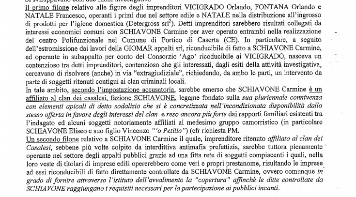 Il resto dello stralcio che pubblichiamo oggi ribadisce e approfondisce ciò che abbiamo scritto già nell’illustrazione dei capi d’imputazione provvisoria. La figura centrale, il fulcro dell’indagine si chiama Carmine Schiavone, che da un lato costruisce un rapporto con Orlando Vicigrado, Orlando Fontana e Francesco Natale, i primi due costruttori edili, il terzo imprenditore nel settore delle forniture ad ingrosso per igienici della casa, dall’altro con una pletura di piccole imprese che lui muove in diversi comuni della provincia di Caserta, magari non attenzionatissimi dai riflettori della cronaca. Comuni che abbiamo già elencato nell’articolo di ieri (QUI LA LISTA).