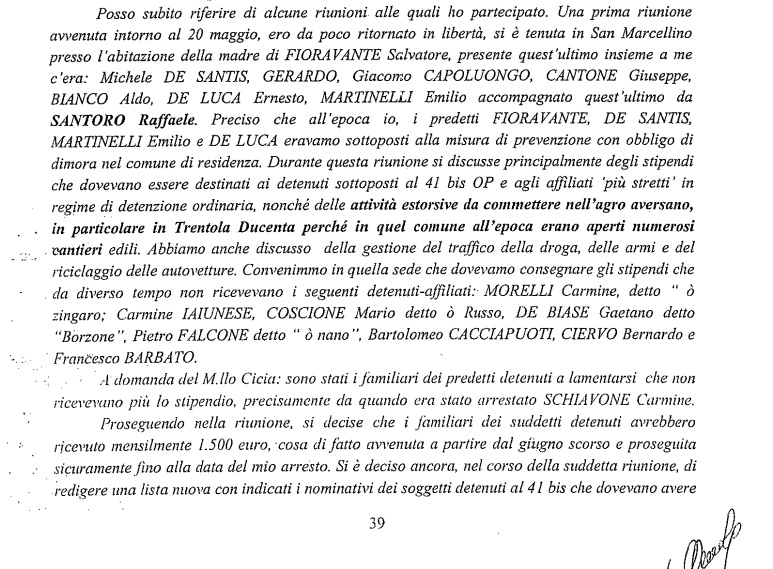 Alla riunione, oltre a Capoluongo, Orabona e Fioravante, c’erano anche Michele De Santis, il famoso Gerardo di cui non si riesce a stabilire il cognome nell’ordinanza, Aldo Bianco, Giuseppe Cantone, Ernesto De Luca ed Emilio Martinelli, accompagnato da Raffaele Santoro. Si procede con una sorte di ordine del giorno: in prima battuta vengono affrontate le lamentele delle famiglie di alcuni detenuti non di primissimo piano ma che evidentemente il Clan dei casalesi riteneva meritevoli di un sostegno. E questo aiuto viene ripristinato: 1500 euro per ognuno delle famiglie di Carmine Morelli O’ Zingaro, Carmine Iaiunese, Mario Coscione O’ Russo, Gaetano De Biase Borzone, Francesco Barbato, Bernardo Ciervo, Bartolomeo Cacciapuoti e Pietro Falcone O’ Nano.