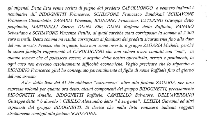 Ma il passaggio più interessante da noi scelto stasera è costituito da una precisa spiegazione dei motivi per cui, da questa cassa, non vengono inviati soldi ai componenti del gruppo Zagaria e agli altri bidognettiani. Racconta Salvatore Orabona che è Giacomo Capoluongo a spiegare che sono stati proprio la famiglia Zagaria a chiedere espressamente di non ricevere i soldi perché in un tempo segnato da decine e decine di arresti, temono i componenti di questo gruppo criminale rampante possano, una volta in carcere, diventare collaboratori di giustizia. Vengono depennati dall’elenco altri bidognettiani per loro – racconta Orabona – espressa volontà. Ninete soldi, dunque, dalla cassa di Capoluongo per Aniello e Raffaele Bidognetti, Salvatore Cantiello, Giuseppe Dell’Aversano O’ Diavolo, Giovanni Letizia e Alessandro Cirillo O’ Sergente, dunque due esponenti di spicco del gruppo di Setola, e altri di cui Orabona, almeno in questo verbale non formula i nomi.