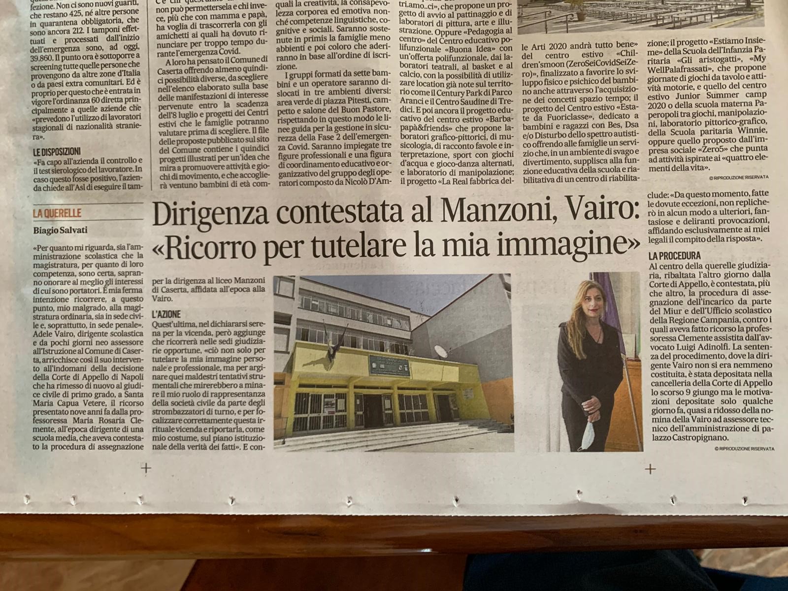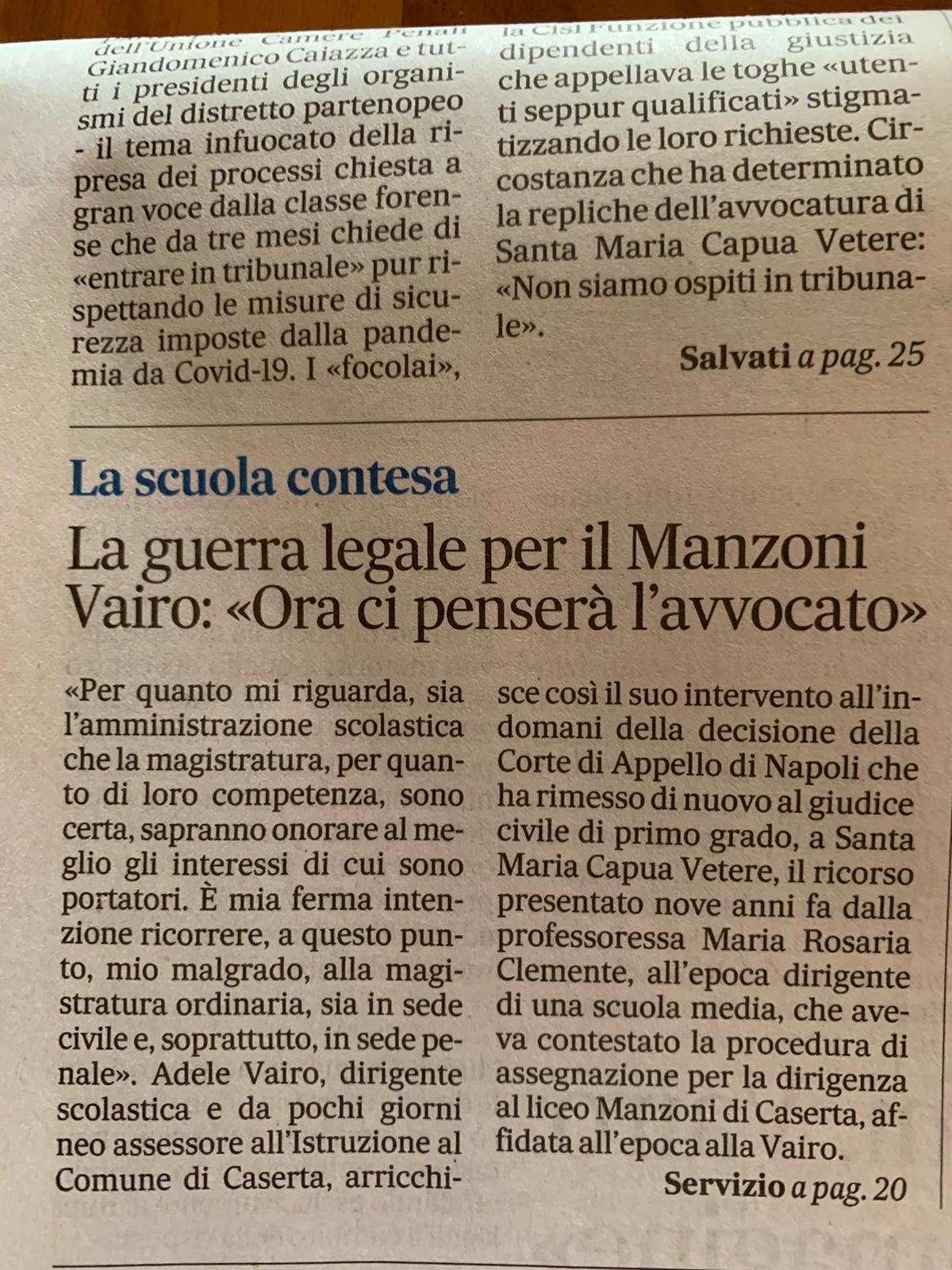 La questione non è quella, ormai stucchevole e datata, raccontata in una narrazione surreale da parte della Vairo, che per cultura che si collega, non individualmente, ma come componente di un blocco sociale purtroppo egemone, in un territorio non a caso fra i più arretrati d’Italia, al contenuto di una notizia, riducendo banalmente ogni cosa a fantomatici disegni di attacco alla persona. Questa narrazione che questi giornali assumono passivamente e acriticamente viene depistata sulla parva materia della disputa  tra la Vairo e CasertaC’è, puntualmente e forse non casualmente, allo scopo di distrarre chi legge dal senso vero di un caso, intorno al quale il nostro giornale, dopo aver fornito notizia di un evento incontestabile, cioè la sentenza di un’autorevolissima Corte di Appello, esprime anche libere opinioni, giammai rilevanti la vita e le opere personali della Vairo, ma sempre ciò che essa ha espresso ed esprime come servitrice dello Stato, visto e considerato che un preside di una scuola serve lo Stato e, non a caso, dallo Stato, dunque dalle tasche di ognuno di noi viene pagato, come e forse più di quanto non lo possa servire un generale delle forze armate. Pensate un poco, Caserta da questi punto di vista è veramente una provincia unica al mondo, qui, a 72 ore dalla pubblicazione del primo articolo,
