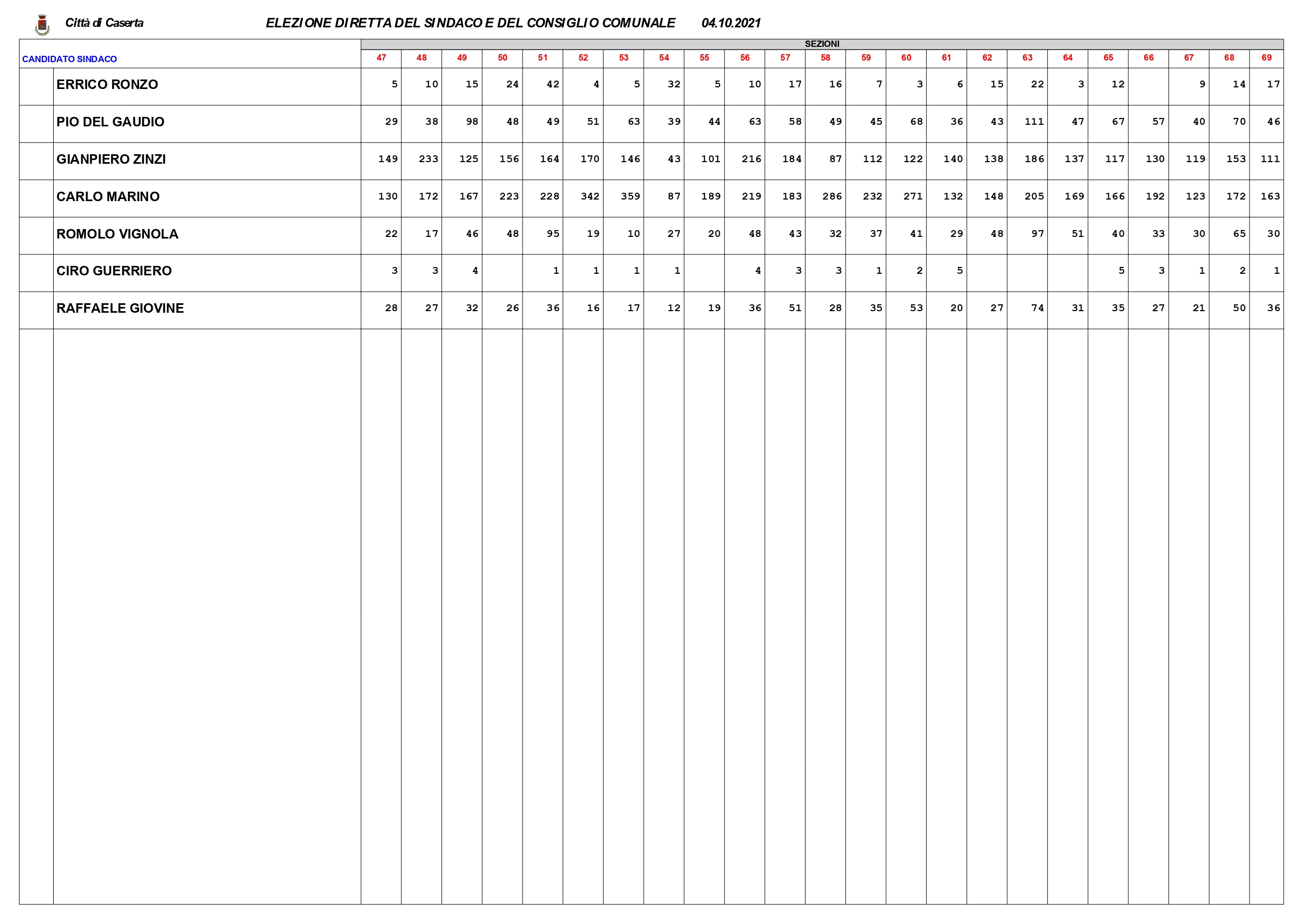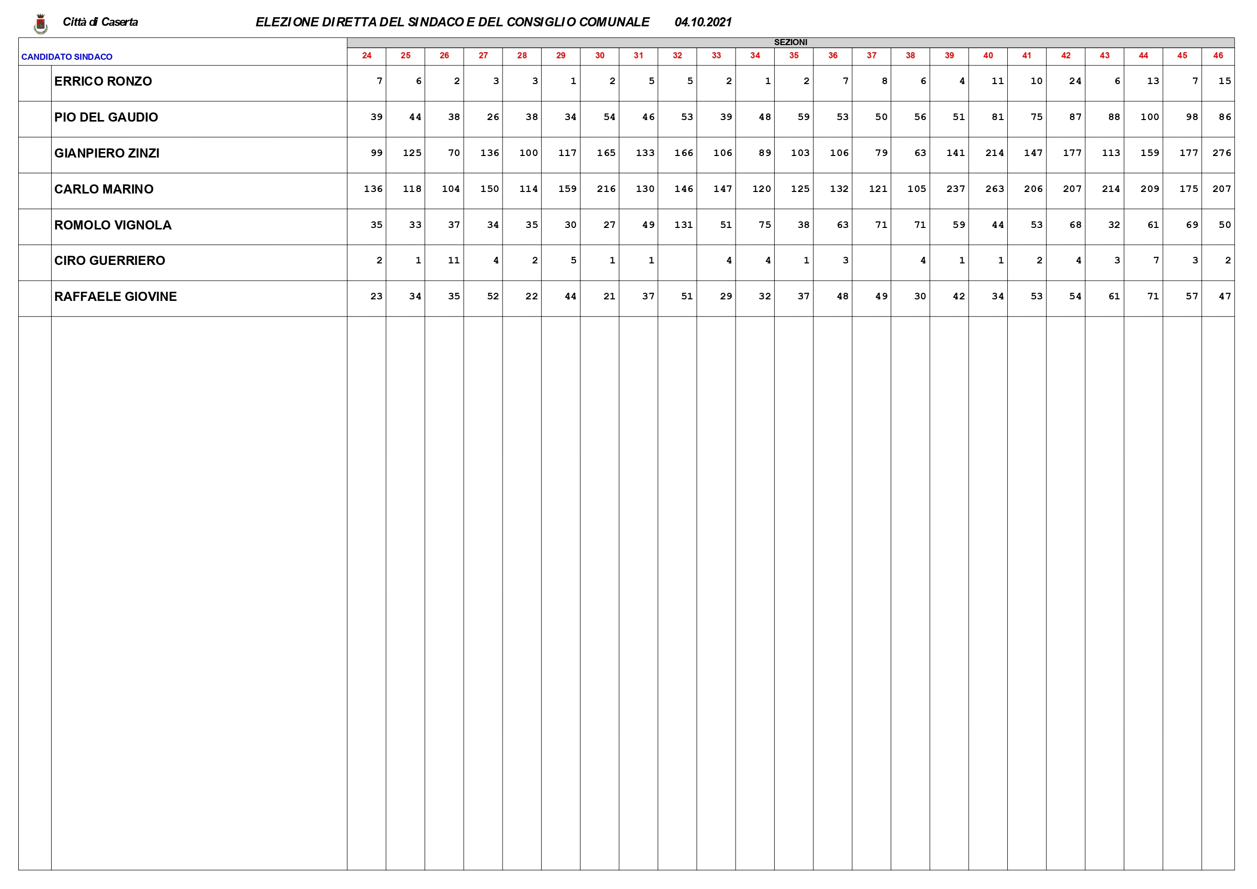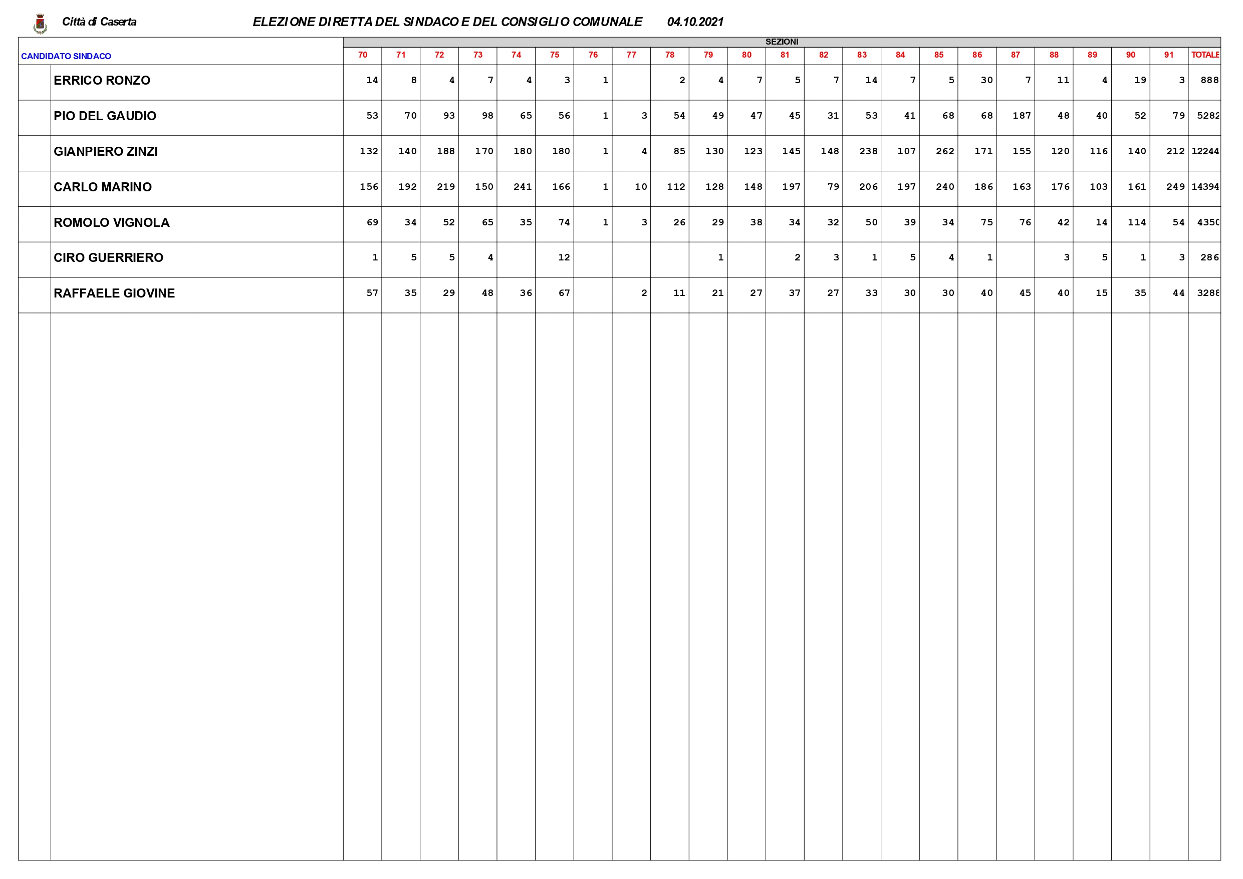 Scorrendo il nostro articolo troverete anche le immagini delle preferenze che i sette candidati sindaco hanno ottenuto nelle 91 sezioni della città capoluogo. Per quanto concerne i candidati al consiglio comunale mancano quelli della numero 41, di piazza Ungaretti n.7 a Falciano di Caserta, ma abbiamo verificato che l’ultimo numero successivo alle indicazioni della sezione n.91 è correttamente corrispondente al dato aggregato, complessivo delle preferenze raccolte da ognuno dei candidati