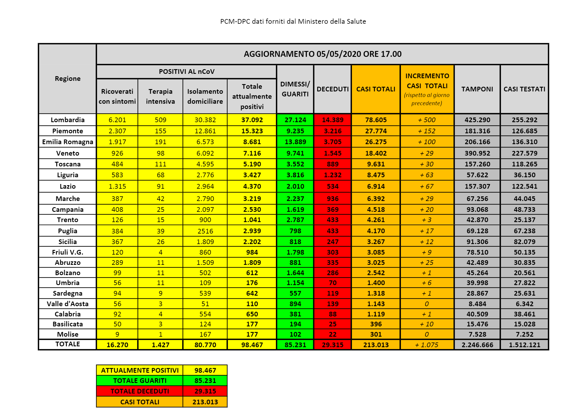 L’altro dato che conta è quello degli attualmente positivi o malati, comprendendo anche i positivi asintomatici registrati. Oggi è stato registrato il decremento di 1.513 unità, mentre ieri era stato solo di 199 malati. Il dato complessivo delle persone che dall’inizio dell’epidemia si sono ammalate tocca quota 213.013, di cui, purtroppo, 29.315 sono decedute. Questo dato comprende i decessi del report odierno, 236, quarantuno in più rispetto al report di ieri. I guariti tornano ad una quota importante, 2.352, ieri erano state 1.225. Ritornando agli attualmente positivi, il numero dei nuovi positivi odierni, quello dei guariti e quello dei deceduti, porta il dato a 98.467. Di queste, 1.427 sono ricoverate in Terapia Intensiva, meno 52 rispetto ai 1.479 di 24 ore fa. Robusta riduzione anche per i ricoverati con sintomi nei reparti covid. Il report di oggi 16.270, ben 553 in meno di ieri. Ciò significa che si sono liberati un uguale numero di posti letto e i nosocomi, soprattutto quelli del nord, cominciano davvero a respirare.