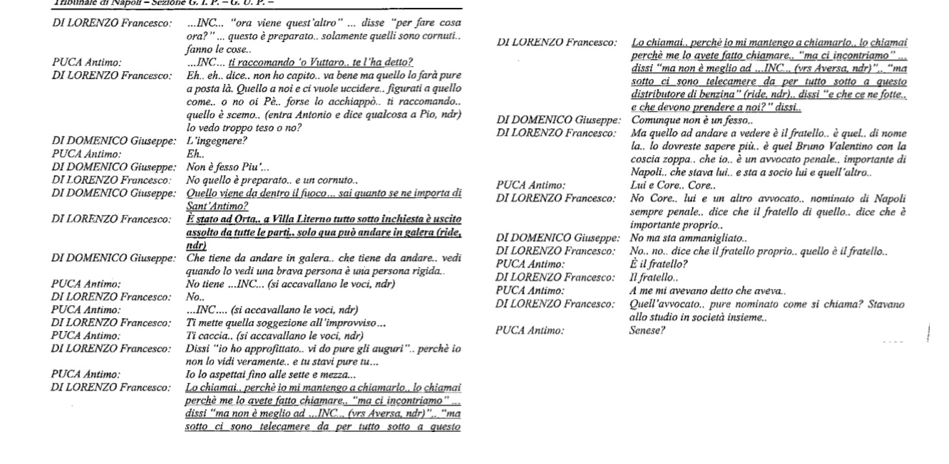 La conversazione tra i tre continua e di Lorenzo, dopo aver sottolineato la scaltrezza e le capacità criminali Valentino, ricorda ai suoi ascoltatori come l’ingegnere sia uscito indenne da diverse vicende giudiziarie che lo hanno interessato proprio quando ricopriva lo stesso incarico che svolgeva a Sant’Antimo anche nei comuni di Orta di Atella e Villa Literno.