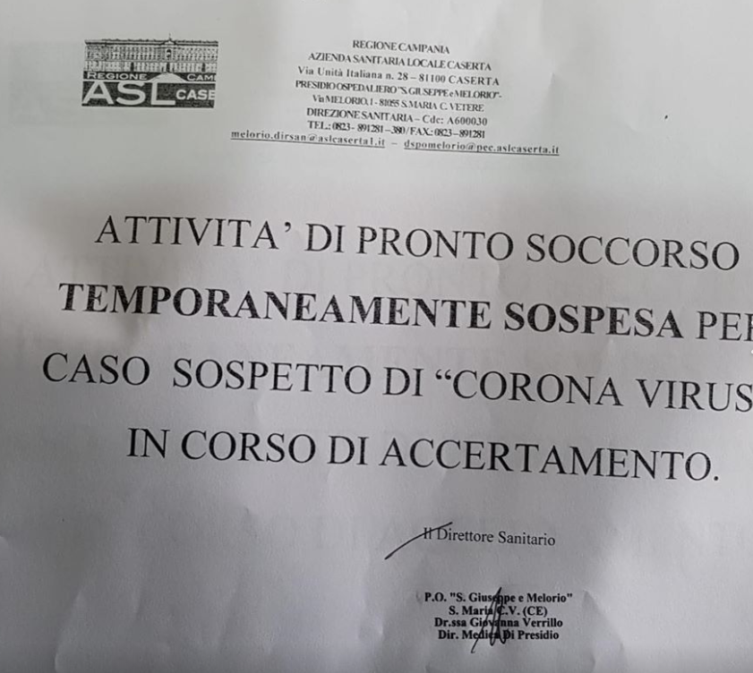 SANTA MARIA CAPUA VETERE – E’ momentaneamente sospesa l’attività del pronto soccorso dell’ospedale Melorio di Santa Maria Capua Vetere per l’arrivo di una persona che è stata sottoposta ad accertamenti per Coronavirus. I risultati del tampone saranno resi noti dopo le 18. La notizia è stata diffusa da Ciò che vedo in città smcv.