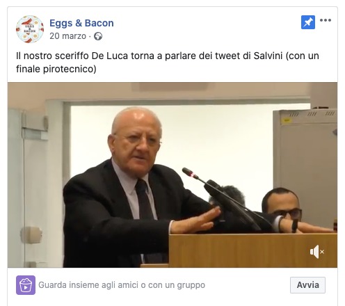 Fino ad ora, abbiamo esplicitato la modalità di azione del social media manager di Vincenzo De Luca, cioè del casaleggino di turno. Qualcuno potrebbe chiederci di fare qualche esempio, magari nei prossimi giorni torneremo sull’argomento e vi forniremo altri nomi delle pagine utilizzate nella strategia elettorale del governatore. Oggi ci limitiamo a segnalare un’esperienza casertana. Una pagina ben preparata e ben presentata: si chiama Eggs and Bacon e, in calce a questo articolo, vi forniamo un breve esempio di un post recentissimamente pubblicato. Non è una cosa saltata fuori dal nulla, ma proprio ciò che serve per rendere credibile i suoi contenuti. Si tratta, infatti, di un “progetto universitario di satira politica” continuato anche dopo la sperimentazione a “La Sapienza” di Roma. La pagina fa un lavoro di contorno, ovviamente non idolatra De Luca, per i motivi summenzionati. Ma ha due topic chiari, rispetto agli obiettivi da raggiungere: non far crescere la Lega in Campania in misura tale da rendere impossibile la rielezione di De Luca e, contemporaneamente, far risaltare ed evidenziare un proprio consenso alle esternazioni del governatore, badando bene, come vediamo, di utilizzare quelle parole che il popolo della Campania di mezzo possa avvertire come familiari, in sintonia con i propri interessi e la propria sensibilità: “Stasera il nostro sceriffo”. Il termine sceriffo non è buttato lì casualmente, ma risponde ad una precisa strategia di marketing politico, che viene organizzato rispetto ad un target.