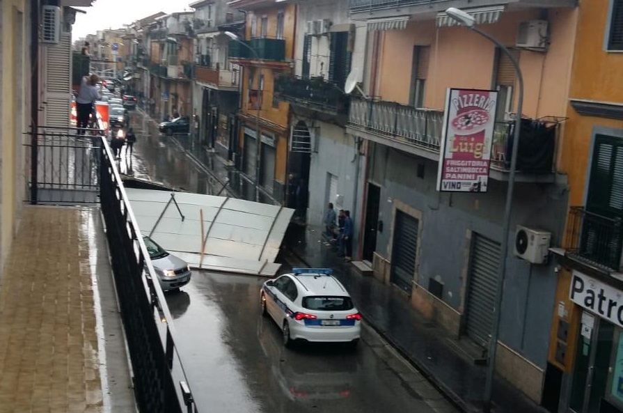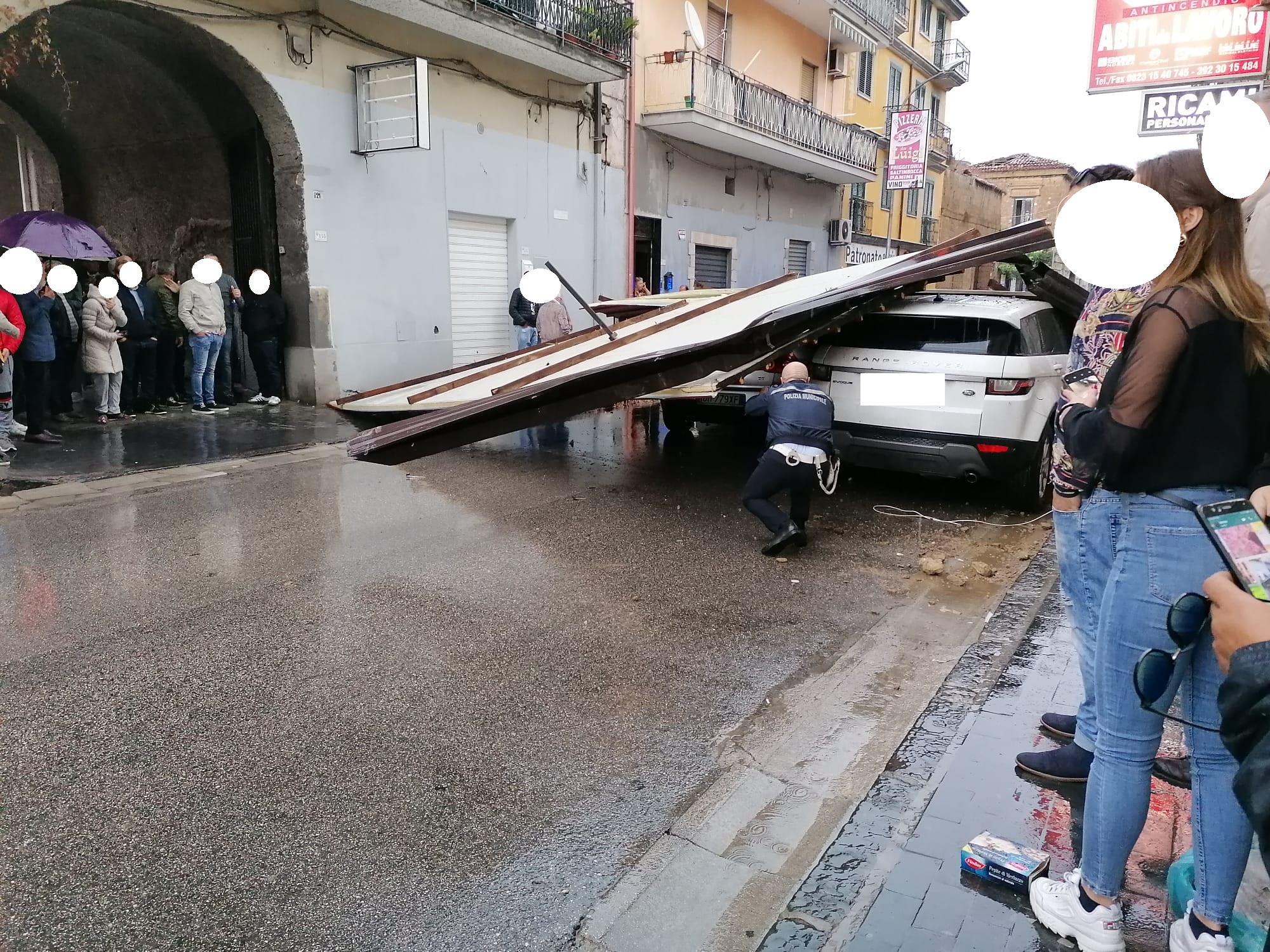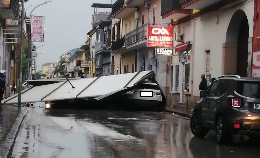 L’ultimo, in ordine di sequenza, è accaduto poco fa in via Musone a Marcianise dove una copertura di un noto negozio di abiti da lavoro, si è scardinata piombando su due auto, parcheggiate in strada.