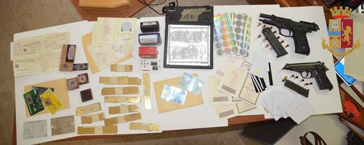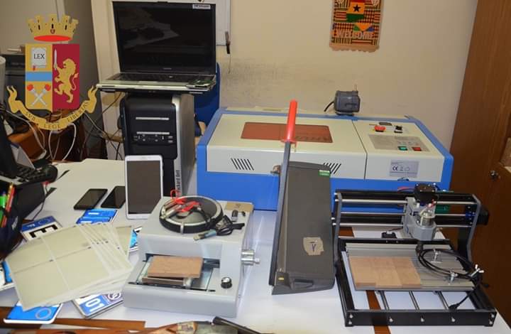 La perquisizione, inoltre, ha permesso di accertare che I.V. aveva allestito presso la sua abitazione una vera e propria centrale per la contraffazione. Infatti, veniva rinvenuto materiale informatico, meccanico ed elettronico, tra cui una stampante 3D, una fresatrice, una punzonatrice, un tagliacarte professionale e computer, utili alla contraffazione di targhe per autovetture, documenti di ogni tipo, carte di credito e altro. Peraltro, venivano rinvenute tre carte d’identità, valide per l’espatrio, e tre banconote di 20 euro che, per quanto di ottima fattura, erano da ritenersi contraffatte, nonché una gran quantità di documenti “in bianco”, carte di circolazione, circa 100 tessere con banda magnetica e microchip “nuove”, oltre 30 targhette riportanti telai di autovetture, circa 1000 ologrammi di forma circolare, timbri di funzionari amministrativi di vari comuni, anche esteri, e altro. Gran parte del materiale appena citato è risultato provento di furti commessi su tutto il territorio nazionale.
